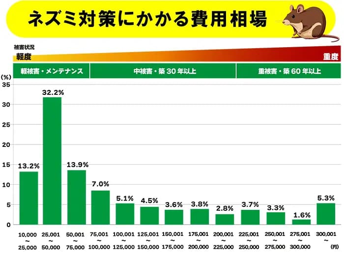 ネズミ駆除の平均的な料金は3~5万円程度が大半ですが、被害状況が大きいと10~30万円までかかることがあります。ネズミ駆除にかかる料金の相場についてグラフをご覧ください。