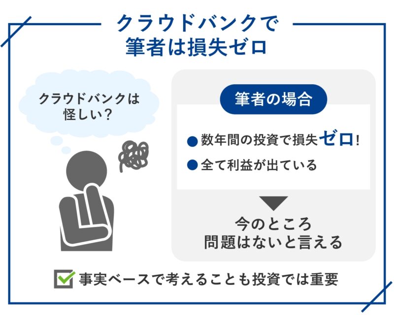 中にはクラウドバンクは危険なのではないか、損をするのではという噂もあるようですが、結論として一度も損をしていません。