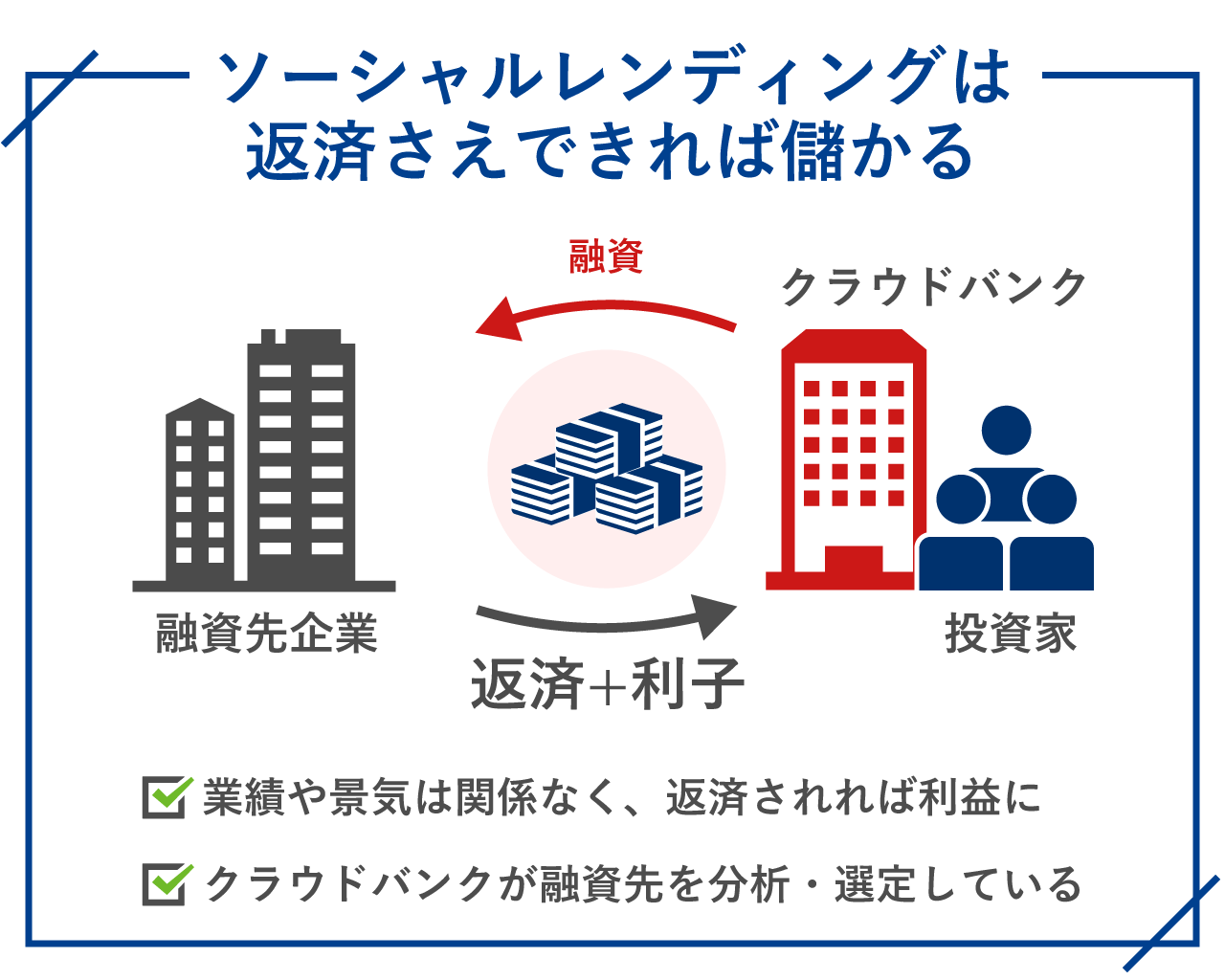 一方、ソーシャルレンディングでは、貸付先の業績が悪化しようが、世の中全体が混乱している時期であろうが、サービス会社を通して貸している資金を回収さえできればよいわけです。