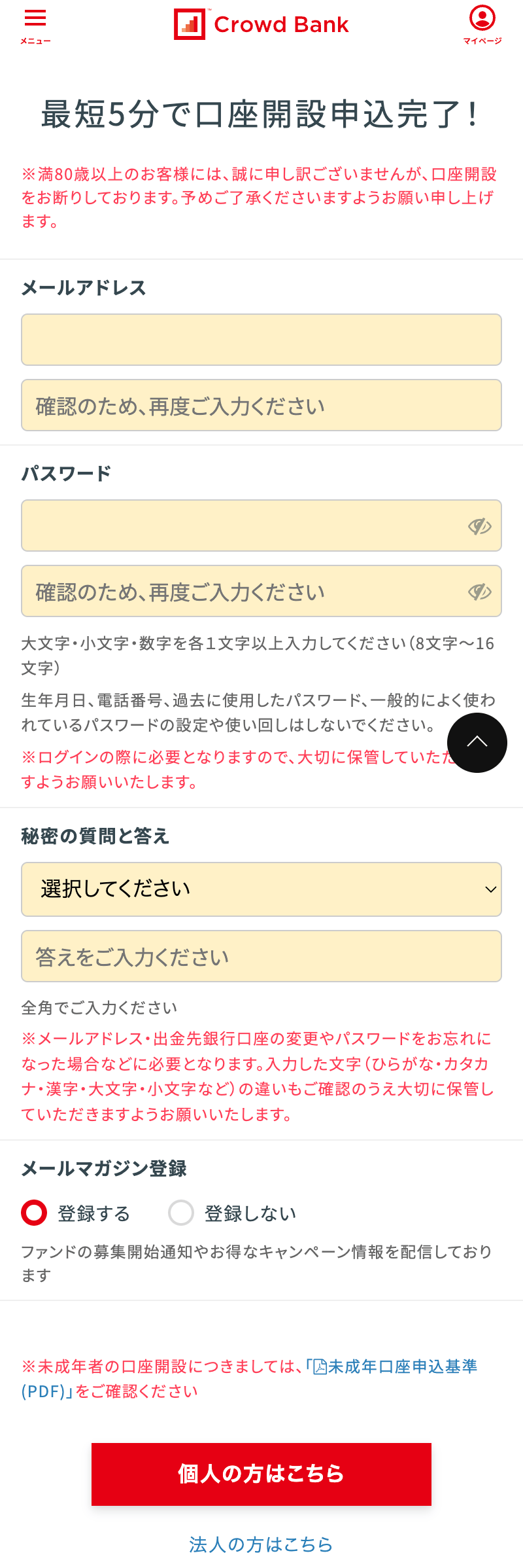 2.メールアドレスやパスワードなどを入力し「個人の方はこちら」をクリックします
