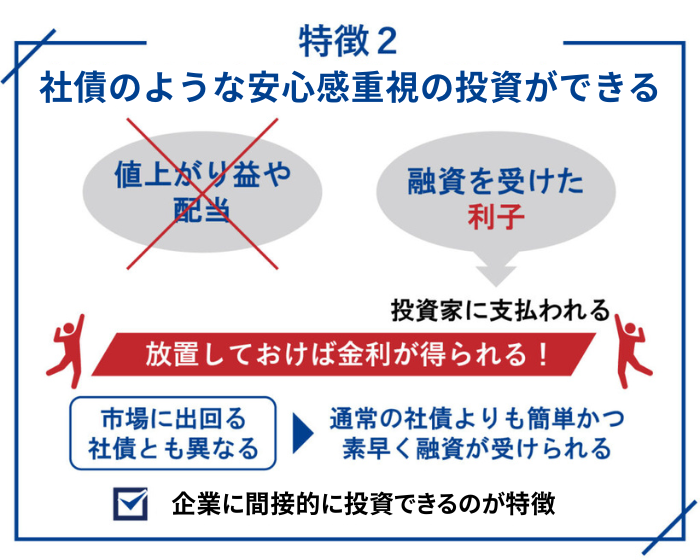 値上がり益や配当ではなく、貸し付けたお金に対する利息が投資家に支払われます。