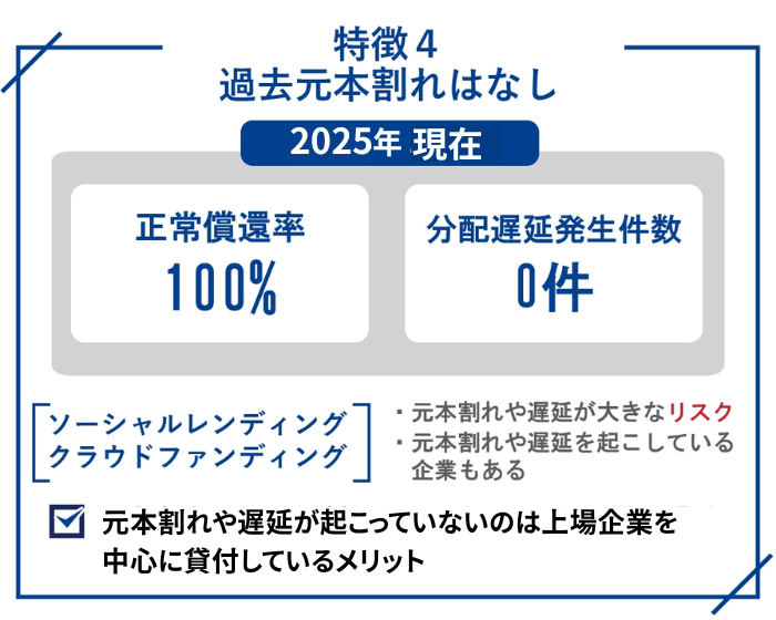このように、元本割れや遅延が起こってないのは、上場企業を中心に貸付しているメリットといえるでしょう。