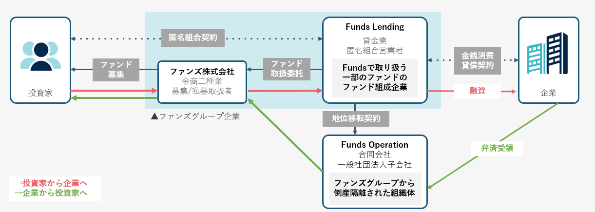 元本および利息返済時にはファンズグループから倒産隔離された組織を通じて返済されるため、万が一、Fundsを運営するファンズ株式会社およびグループ企業が万が一倒産した場合でも運用中ファンドが元本割れに陥る事態を回避する仕組みが整えられています。