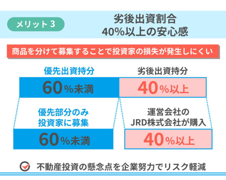 そして劣後部分の方は、運営会社であるJRD株式会社が購入するという商品スキームを採用しています。