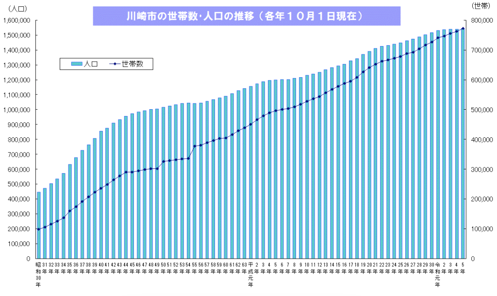 川崎市の人口は右肩上がりで増え続け、現在では150万人ほどです。