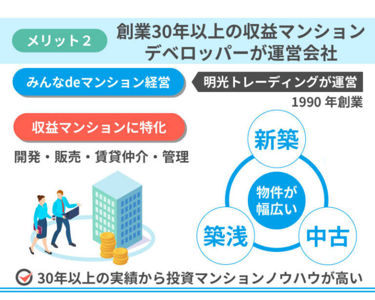 みんなdeマンション経営は、投資用マンションデベロッパーで有名な明光トレーディングが運営するサービスです。