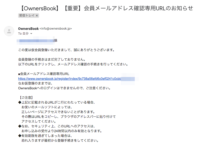 メールアドレスの確認を行うため、登録したアドレスにメールが送られてきます。