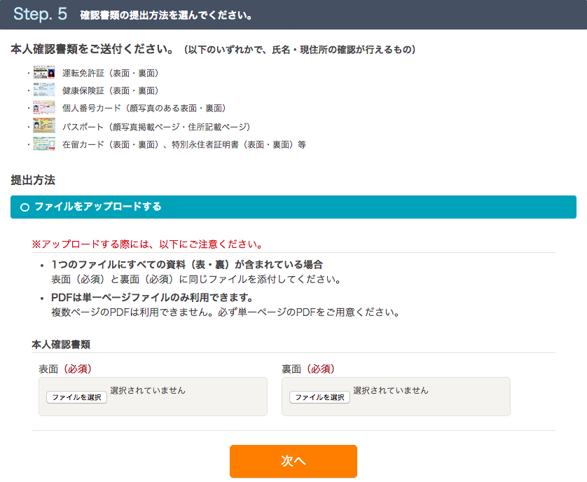 7.指定の本人確認書類をアップロードして、「次へ」をクリック